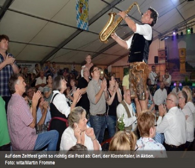 Geri setzt auf eine Vielzahl an Instrumenten, einen Medley-Stil und Nähe zum Publikum. Schon steht er mit dem Saxofon auf einem Tisch tief unten im Zelt. Ein bisschen erinnert er dabei an einen Blues Brother in Lederhosen. Gipfelkönig und ein DJ aus den Bergen sind Motive seiner Lieder. Traditionelle Volksmusik erklingt da natürlich nicht, gefragt sind Partystimmung und Unterhaltung.