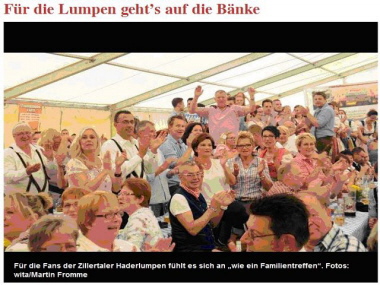 Band-Chef Vitus Amor nennt Michelbach scherzend eine „Weltstadt“ und lobt ganz seriös: „Die kleinen Orte machen es am besten.“ Vor dem Konzert hat er einen Spaziergang über den Huiberg bis zum Segelflugplatz unternommen, um die Gegend beim ersten Besuch kennen zu lernen. Unten im Brühl wartet ein mit rund 1000 Menschen ausverkauftes Zelt auf die Zillertaler Haderlumpen. Der Sieger im Grand Prix der Volksmusik von 2007 hat für einen rasanten Ticketverkauf gesorgt. Karten gingen bis nach Belgien und Nordrhein-Westfalen zu Fanclubs, berichtet der GTEV-Vorsitzende Mario Sgoll. Aus Oberhausen im Ruhrgebiet ist zum Beispiel Lena Buschhaus eigens angereist und aus Frankfurt Nicole Düll. „Das ist wie ein Familientreffen“, erzählen sie und loben die Bodenständigkeit ihrer Idole. Überhaupt steht für sie fest: Die Haderlumpen sind die besten.