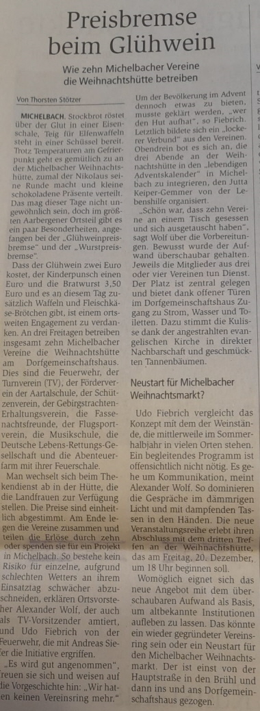 Hinter dem Tresen steht auch Udo Scheliga: Aarbergens Bürgermeister trägt Krachlederne zum weißen Hemd und gilt im Verein als Urgestein. Die Vereinsgründung wird am Biertisch bereitwillig aufgerollt: Bis in die 60er Jahre hätten die Michelbacher auf ihrem Dorfplatz gefeiert, so Sgoll. Zur Anschauung reicht ein Gründungsmitglied schwarz-weiße Fotos herum, die ein Turnerfest auf dem Dorfplatz, „dem Brühl“, zeigen. Scheliga sei Mitglied der 1992 gegründeten Sängergruppe „Huiberg Drops“ gewesen und wollte die Dorfmitte wieder beleben. Mit ihren Trachten aus dem letzten Urlaub gründeten 16 Trachtenträger im Jahr 1994 den GTEV. In der Folge verkauften sie über 400 „Brühl-Patenschaften“ und richteten mit den Einnahmen die Dorfmitte her. Das habe für Toilettenhäuschen und die Schotterung gereicht, erzählt Sgoll.