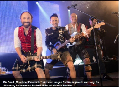 Die Münchner Zwietracht ist laut des Schriftzugs auf ihrem Transporter „die populärste Oktoberfestband der Welt“. Mit einem „Let’s go“ laden die sechs Musiker um Gerry Grass und Wolfgang Köbele zum Feiern ein. Es verschwimmen die Grenzen der Genres, viele Schlager sind im Repertoire dabei wie „Resi, I hol di mit mei’m Traktor ab“ oder Drafi Deutschers „Marmor, Stein und Eisen bricht“.