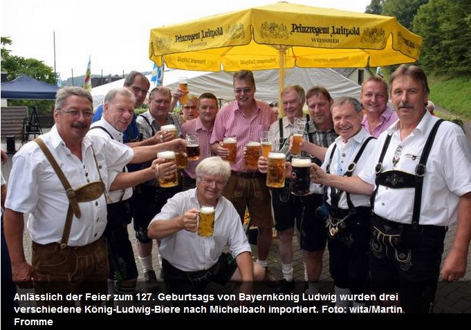 MICHELBACH - Den 127. Geburtstag von Bayernkönig Ludwig begeht man in Michelbach am Sonntag mit einem Frühschoppen. Traditionell erhalten die sogenannten „Brühlpaten“ dazu ein Freigetränk, weibliche Gäste werden mit Sekt und Blumengruß empfangen. Später schunkelt man zu den Hits der „Huiberg Drops“ und stärkt sich mit Weißwurst und Brezeln, mit Fleischkäse und Kartoffelsalat. Dreierlei König-Ludwig-Biere werden hierfür aus Bayern importiert, die Brände kommen aus dem Schwarzwald. Der Frühschoppen diene dem Zusammenhalt, erzählt Mario Sgoll, der den Vorsitz des eingetragenen Vereins mit diesem langen Namen innehat: Gebirgs-Trachten-Erhaltungs-Verein Huiberg Weiß-Blau, kurz GTEV. Als gegen 12 Uhr die „Huiberg Drops“ ihren musikalischen Vortrag starten, sitzen schon erste Gäste vor dem Dorfgemeinschaftshaus, in dem die Gebirgstrachtler ihr Vereinsheim haben.