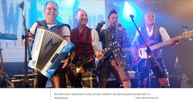 Vorab sorgen schon die Original Mühlbachtaler aus dem Nastätter Raum für Stimmung im Zelt mit einer Mischung zwischen Polka und Pop. Die aus den Gottestalern hervorgegangene Formation versteht es, Folklore mit Titeln wie „Seven Nation Army“ zu verbinden und Partylaune zu erzeugen. Die Leute feiern derweil zünftig bei König-Ludwig-Bier und Schweinshaxen mit Sauerkraut.